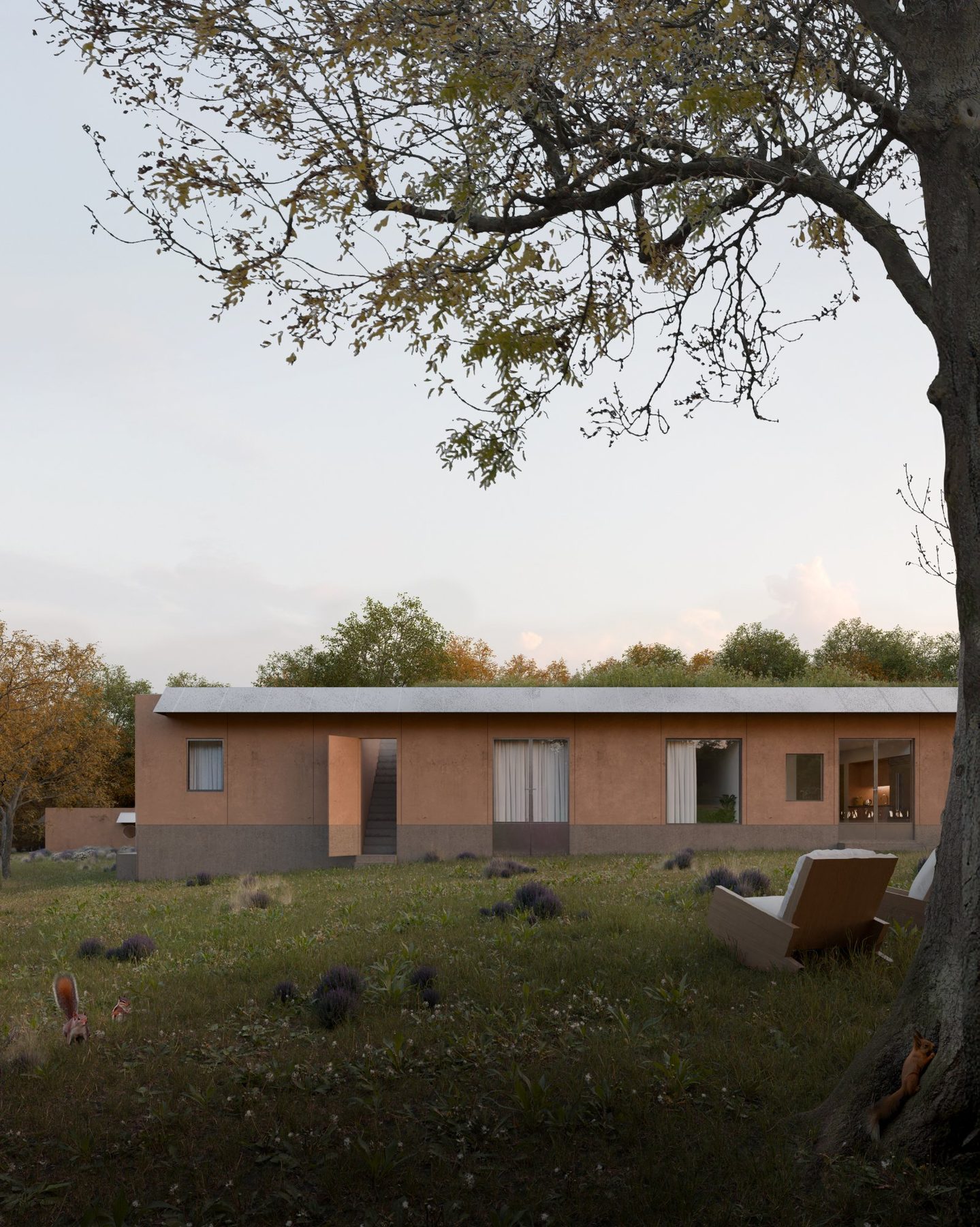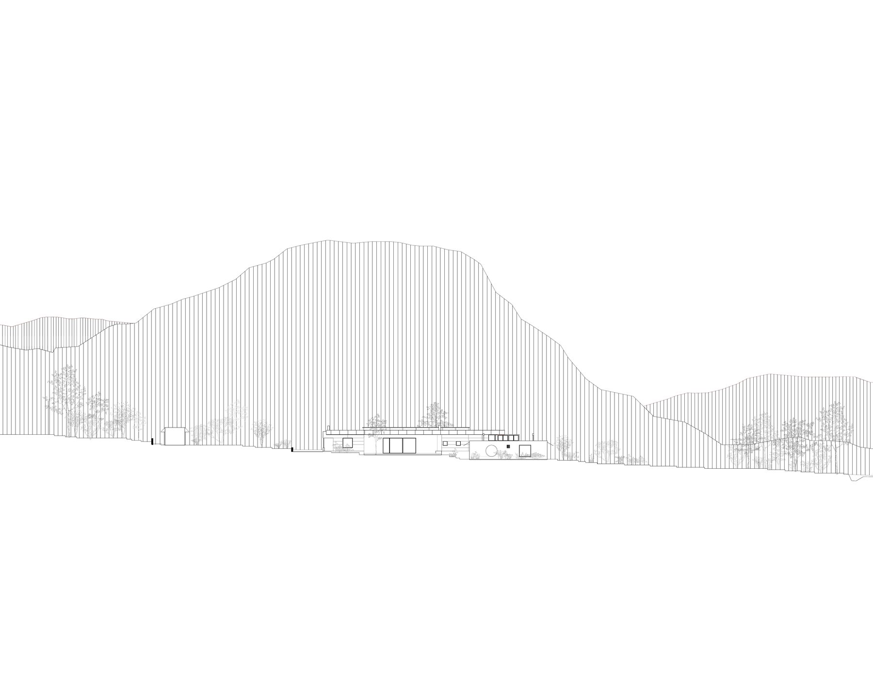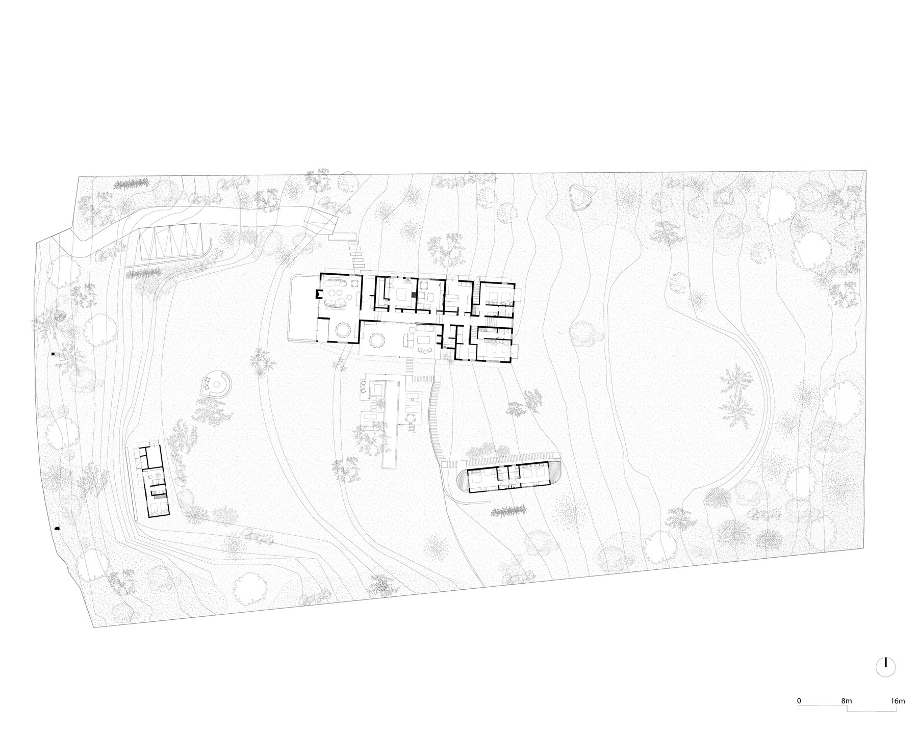 Situada a lo largo del terreno, Oriente-Poniente en un solo nivel, la casa se organiza por una "columna vertebral" al centro que es un pasillo de casi doble altura que te va llevando a los distintos espacios. Este pasillo va bajando paulatinamente con el terreno al igual que cada espacio, dando diferentes alturas y vistas a cada uno. Para tener una comunicación continua con el entorno decidimos separar dos recámaras en un volumen exterior.