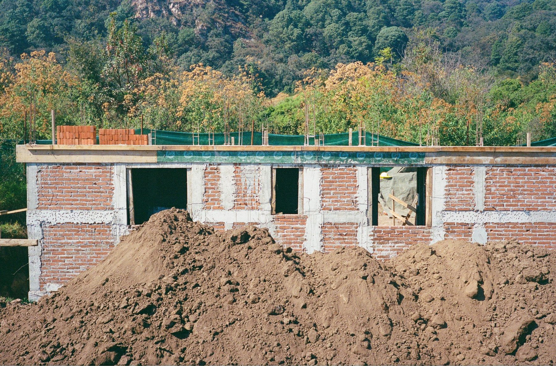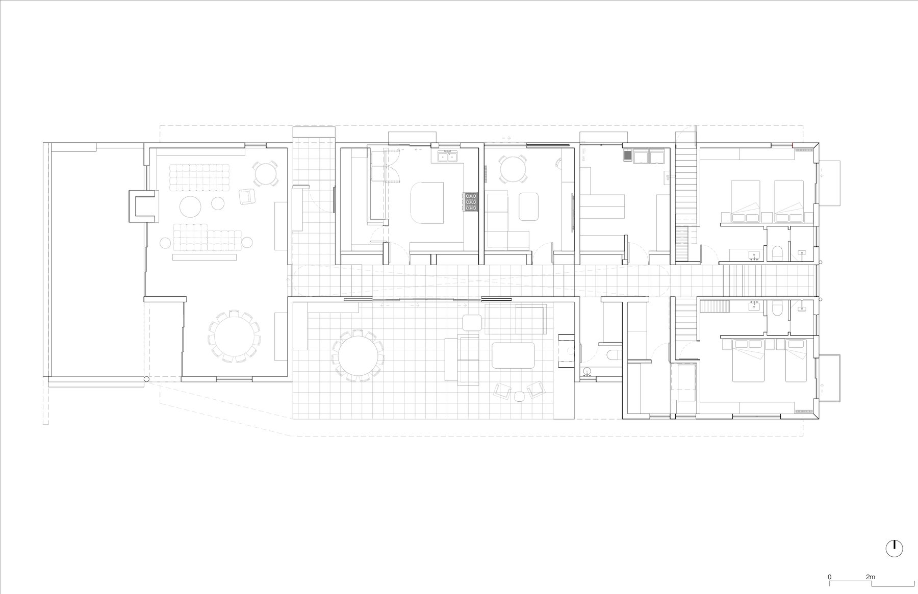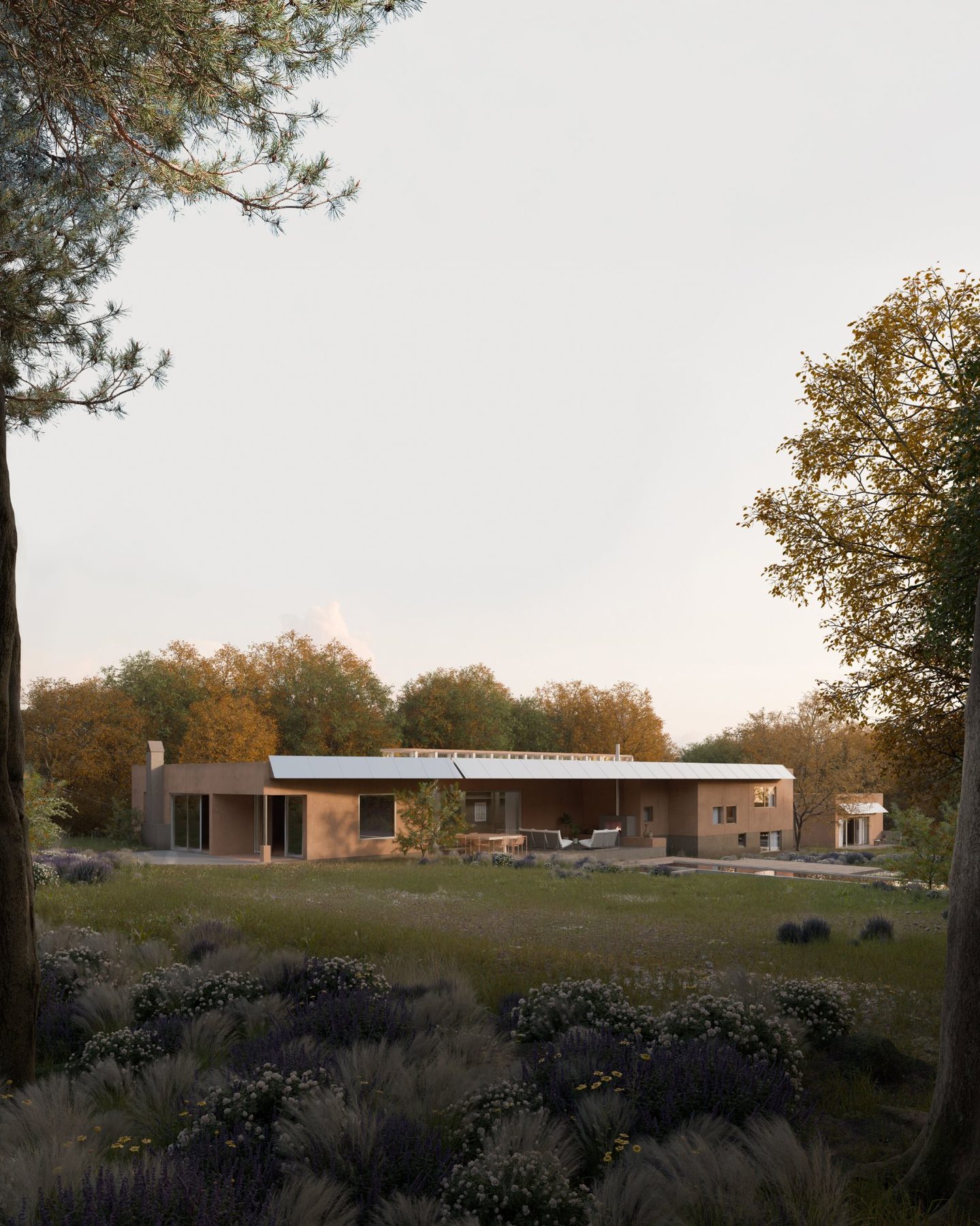 Situada a lo largo del terreno, Oriente-Poniente en un solo nivel, la casa se organiza por una "columna vertebral" al centro que es un pasillo de casi doble altura que te va llevando a los distintos espacios. Este pasillo va bajando paulatinamente con el terreno al igual que cada espacio, dando diferentes alturas y vistas a cada uno. Para tener una comunicación continua con el entorno decidimos separar dos recámaras en un volumen exterior.