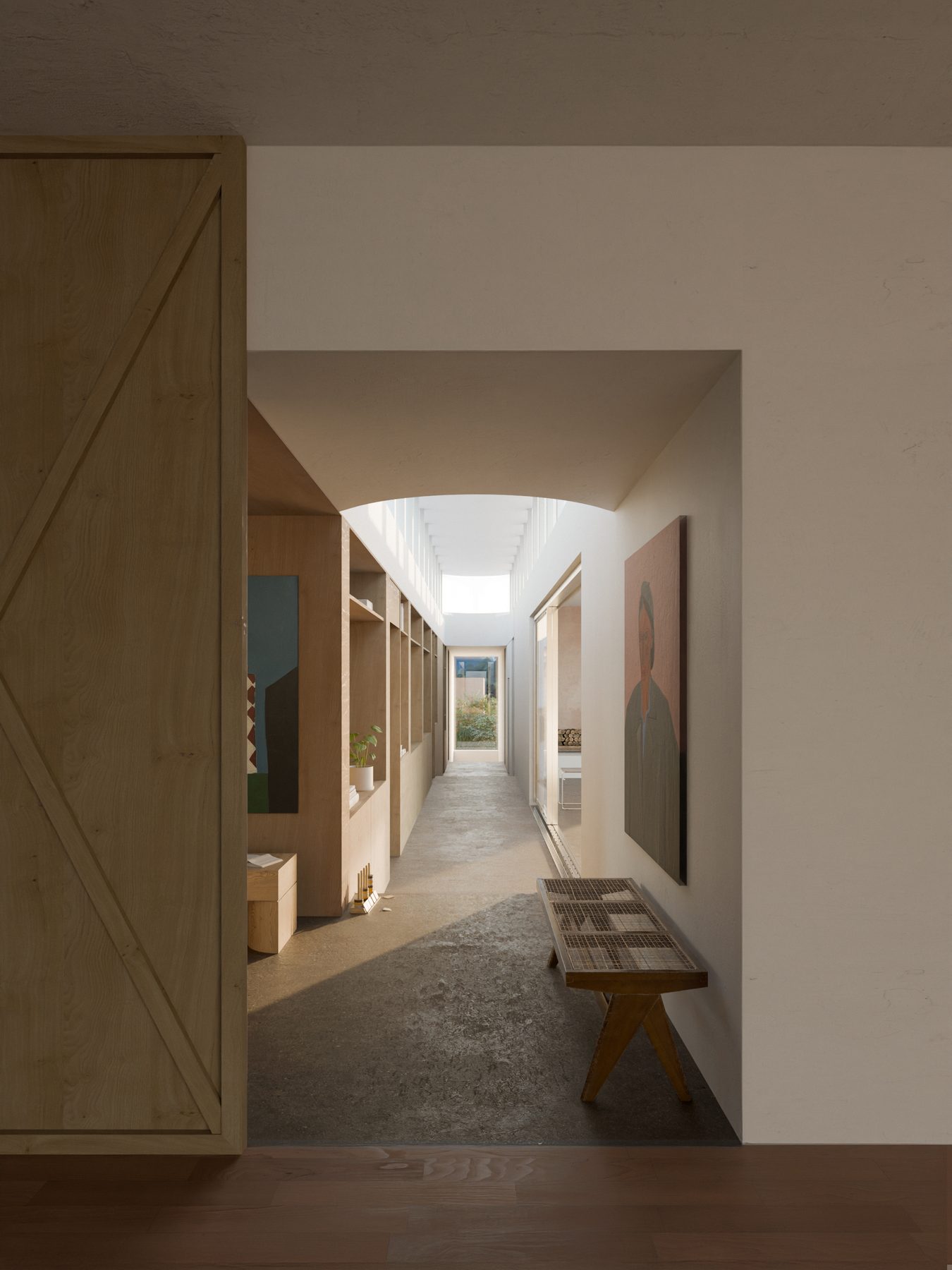 Situada a lo largo del terreno, Oriente-Poniente en un solo nivel, la casa se organiza por una "columna vertebral" al centro que es un pasillo de casi doble altura que te va llevando a los distintos espacios. Este pasillo va bajando paulatinamente con el terreno al igual que cada espacio, dando diferentes alturas y vistas a cada uno. Para tener una comunicación continua con el entorno decidimos separar dos recámaras en un volumen exterior.